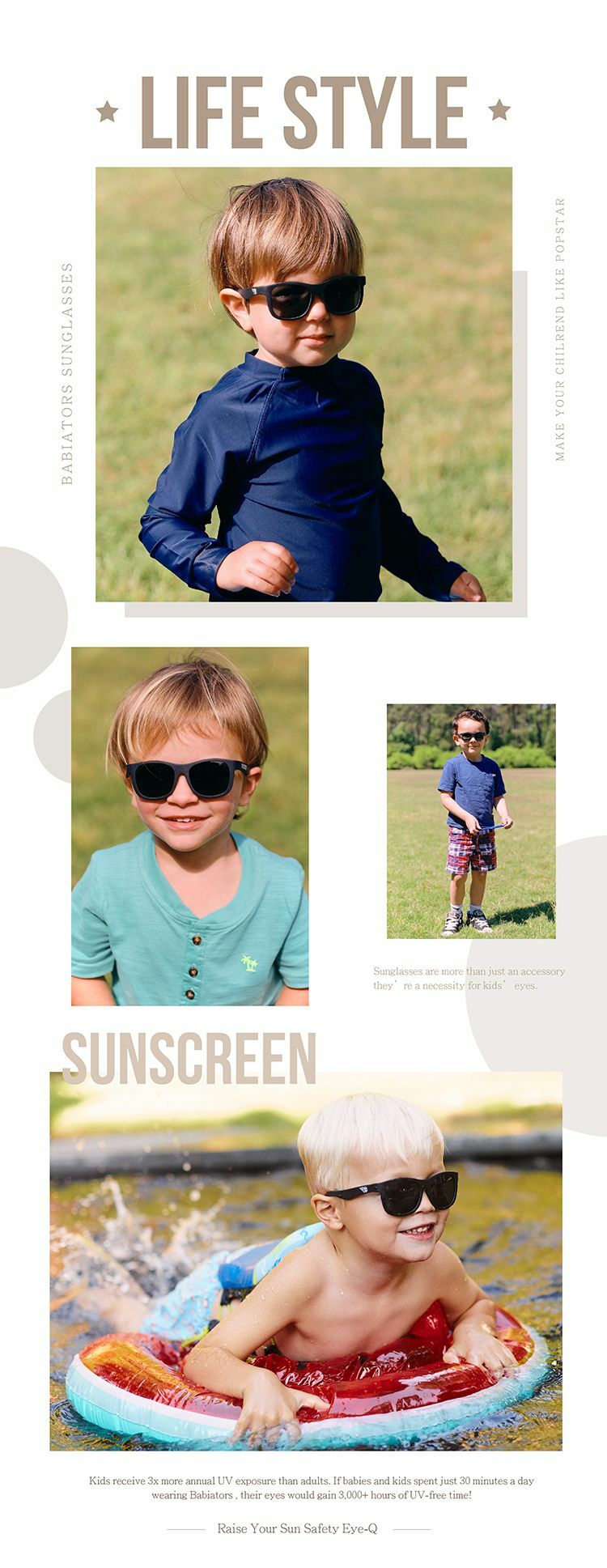 ・此款眼鏡0-2/3-5歲尺碼的邊框印刷為BABIATORS LOGO,6歲尺碼的太陽眼鏡兩側邊框印刷為BABIATORS寶寶頭像。