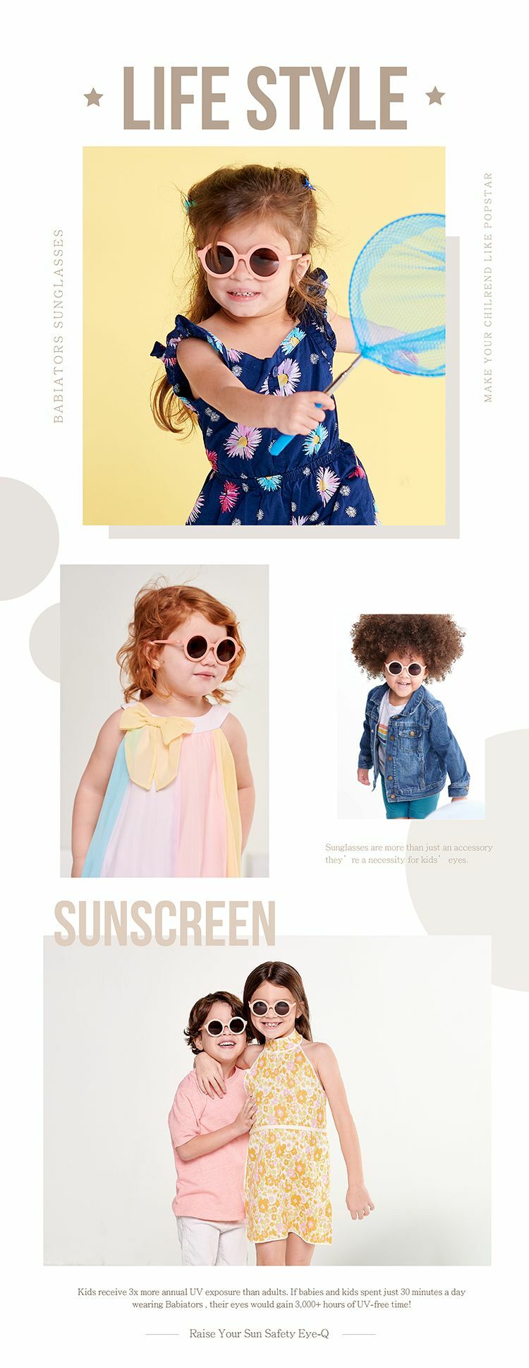 ・此款眼鏡0-2/3-5歲尺碼的邊框印刷為BABIATORS LOGO,6歲尺碼的太陽眼鏡兩側邊框印刷為BABIATORS寶寶頭像。