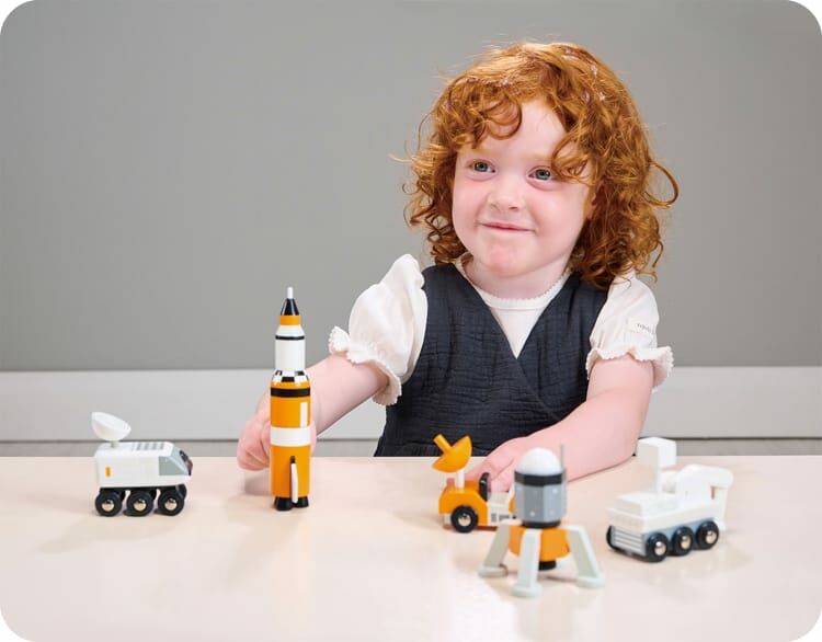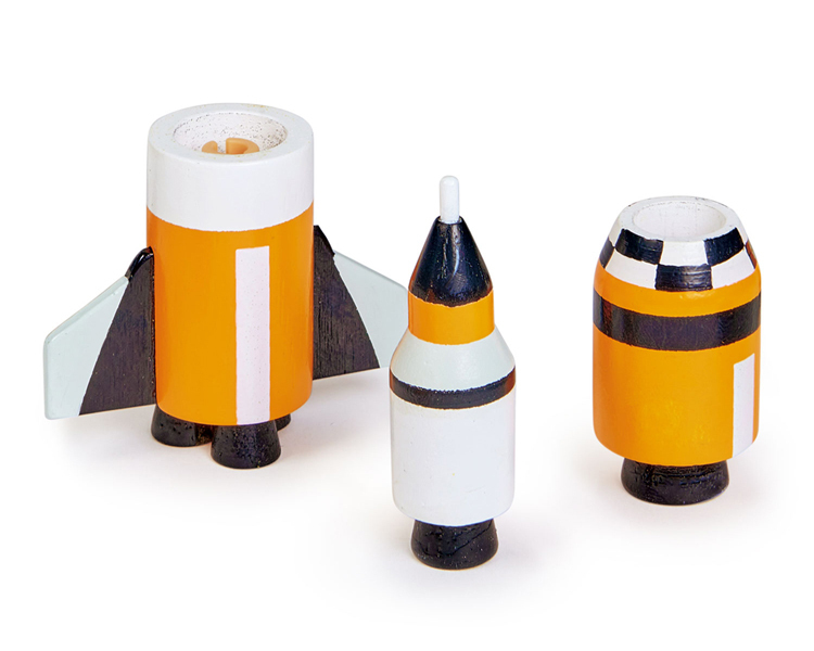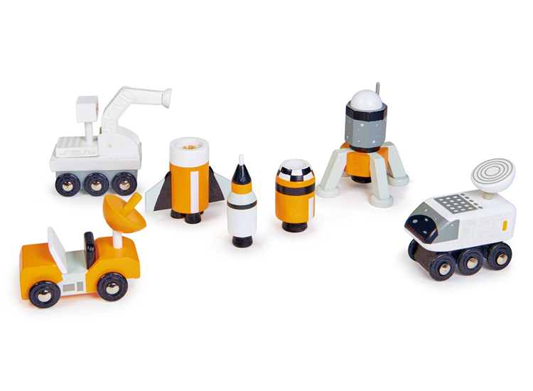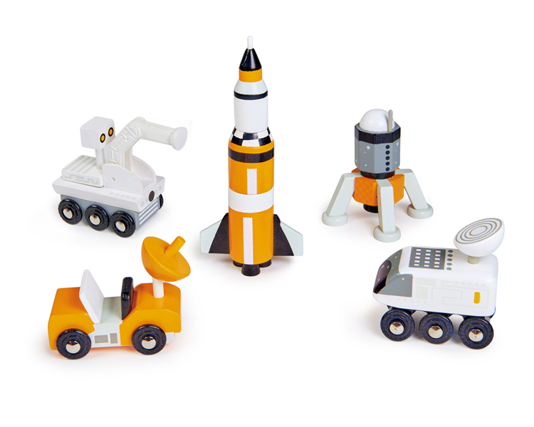這組合適用於進行星際冒險的太空飛行器,其中包含一架3節火箭、登月艙、月球車、一輛發射小組漫遊車和月球探測車。