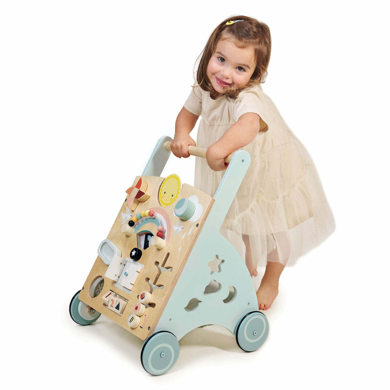一款現代時尚的活動學步車,專為幼兒學習邁出第一步而設計。受天氣啟發,我們包括了一個翻轉到鏡子的太陽、一個轉動的風車、一個帶有珠子的彩虹線玩具、雲上劈啪作響的新月、一個小型雪聲製造器、一個翻轉的北極熊臉和雪花,一個向雪兔打開的窗口,一個用於運行一些磁盤的切出的桿,在所有四個側面都顯示了旋轉的立方體,以及一個帶有旋轉按鈕的小窗口以顯示不同的插圖。我們在手推車的一側安裝了 4 個形狀分類器,在另一側安裝了 3 個旋轉齒輪。背面的織物天篷提供額外的存儲空間。