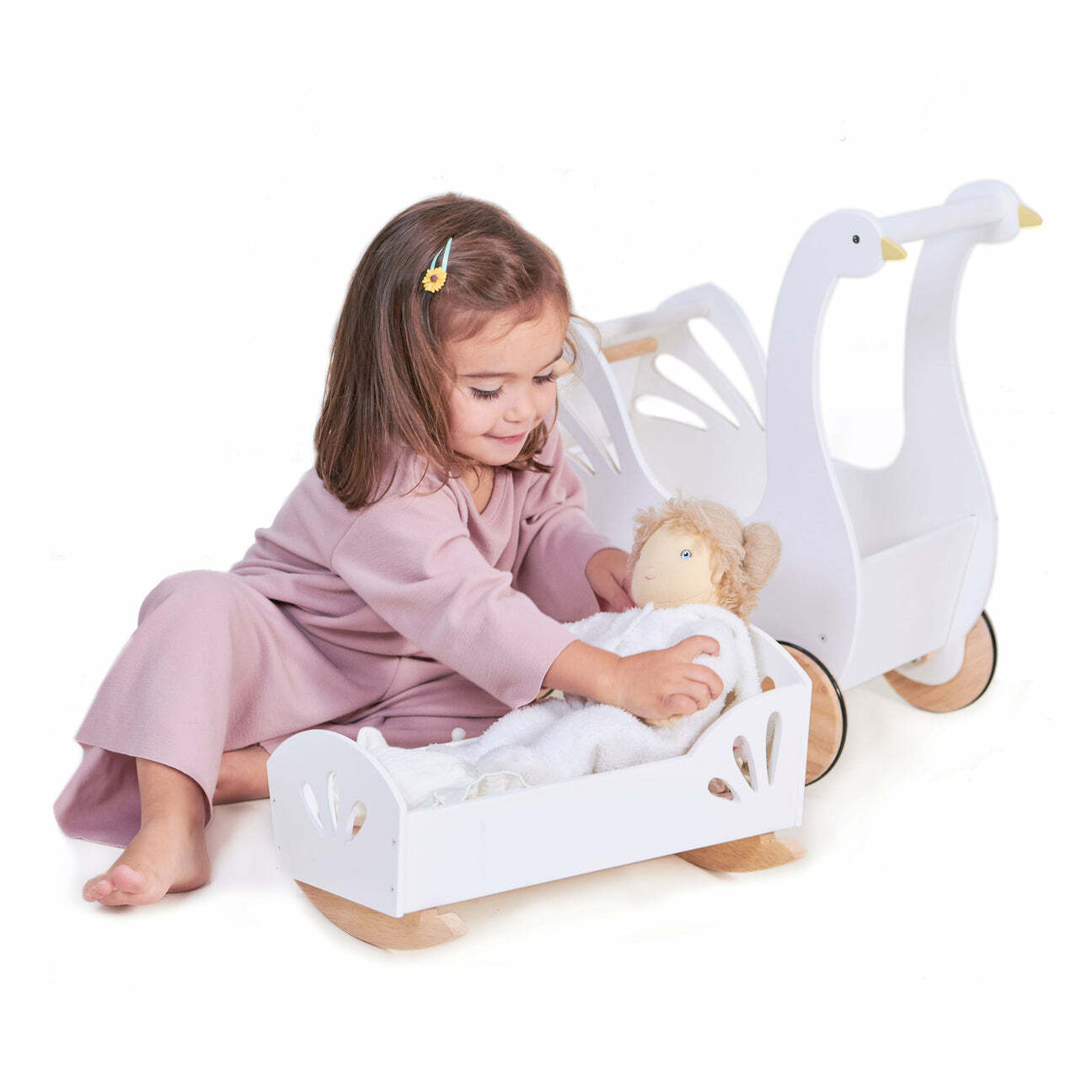 搖晃您的娃娃,讓您在這款可愛的嬰兒床式小娃娃床上入睡。這張小床塗成白色,帶有鏤空特徵和天然木搖椅,適合嬰兒娃娃或泰迪熊。配有腮紅床墊、平紋細布床罩和枕頭,並配有奢華的褶邊。為了延長游戲時間,我們提供了一個木製嬰兒奶瓶、嬰兒杯和細布圍兜。