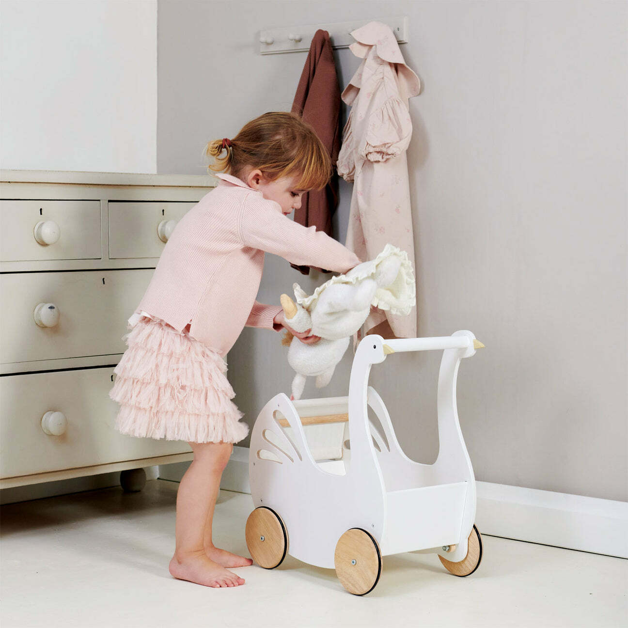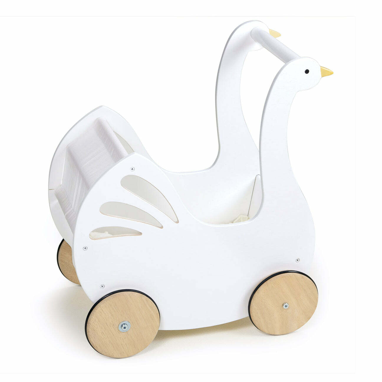 在嬰兒車里和多莉一起四處遊蕩?天鵝形狀的美麗白色越野車,帶有鏤空功能和織物頂篷。帶橡膠飾邊的天然木輪。配有腮紅床墊、平紋細布床罩和枕頭,並配有奢華的褶邊。
