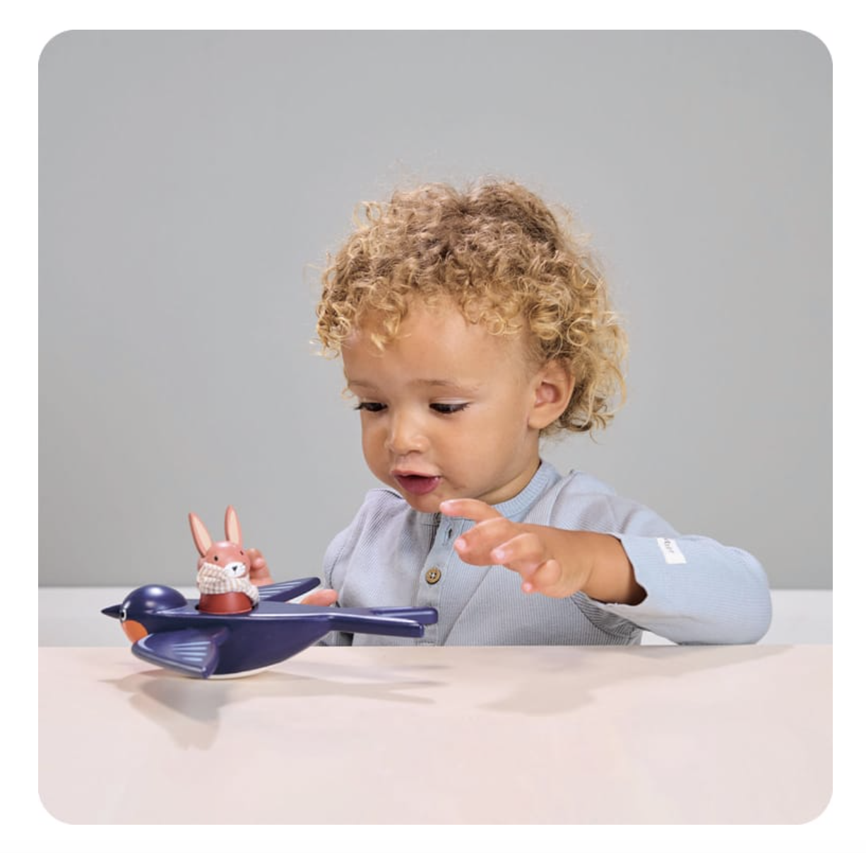在我們的梅里伍德村莊上空高高飛翔的是飛行員野兔史柏德 Spud,由他最好的飛燕朋友史威夫 Swifty 攜帶飛行。小兔子是可拆卸的,牠有一條布質圍巾,下面寫著牠的名字。